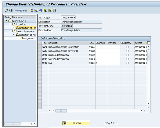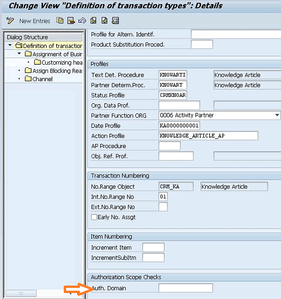 Next, go to the SPRO menu Customer Relationship Management > Transactions > Basic Settings > Define Transaction Types and assign this authorization domain (i.e., KNOWLEDGEARTICLE) to the transaction type by entering it in the Auth. Domain field (