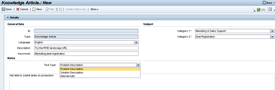 Figure 13). When you create a knowledge article, you can categorize it as a pre-defined categorization schema by providing specific keywords that can be used for search and various text types, such as Problem Description and Solution Description.