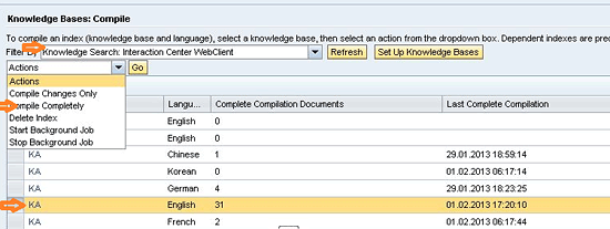 Next, navigate to the CRM WebClient UI in either the IC_SSC_AGENT or IC_AGENT role and create a knowledge article in the required language. Then, log back in to the CRM WebClient UI with the IC_MANAGER role and follow menu path Knowledge Management > Create: SAF Compilation Administration. Filter by Knowledge Search: Interaction Center WebClient, select the appropriate row (i.e., KA with the language you previously selected for it), and select Compile Completely from the Action drop-down menu (
