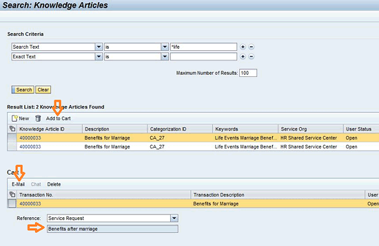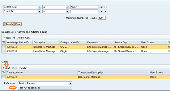 After the search results display, click the articles you require and attach them via the Add to Cart button. Now the knowledge article is transferred as a related article in the selected transaction (i.e., the one available in the Reference drop-down menu in