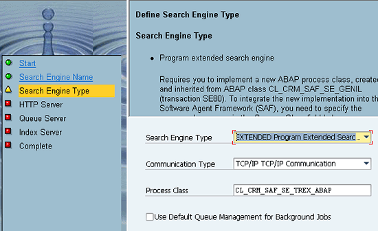 In the next screen in the wizard, enter the Search Engine Type. Select the EXTENDED Program Extended Search Engine and enter the relevant information for Communication Type and Process Class (Figure 7).