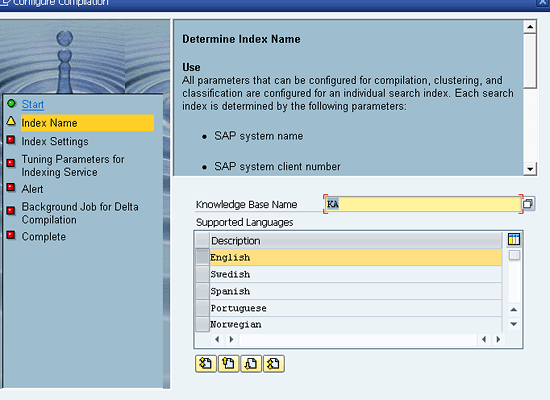 Next, you need to configure the compilation. For this example, enter the index name KA and select the language required for compilation (