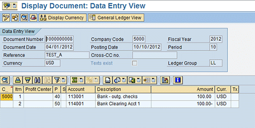 This account also has additional ledger-specific credit and debit postings of $125 in periods 3 and 4 of FY 2012, respectively. Therefore, you have ledger-specific credit and debit postings of $125 that total up the debit and credit postings of $325 in ledger LL as shown in Figure 5. To view the GL account balance, use transaction FAGLB03 or follow menu path Accounting > Financial Accounting > General Ledger > Account > Display Balances (New). I have executed FAGLB03 for GL account 114001 for company code 5000, fiscal year 2012, and ledger LL.