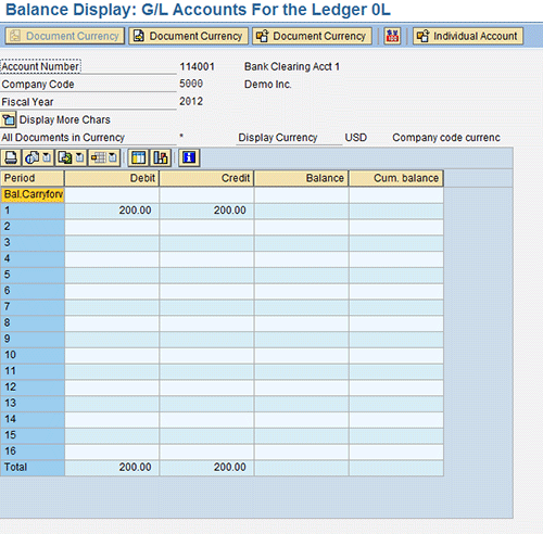 Let’s first analyze the FAGLB03 – GL Balance Display for GL account 114001 and company code 5000. GL account 114001 has $200 of debit and credit postings in ledger 0L (Figure 4). To view the GL account balance, use transaction FAGLB03 or follow menu path Accounting > Financial Accounting > General Ledger > Account > Display Balances (New). I executed FAGLB03 for GL account 114001 for company code 5000, fiscal year 2012, and ledger 0L.