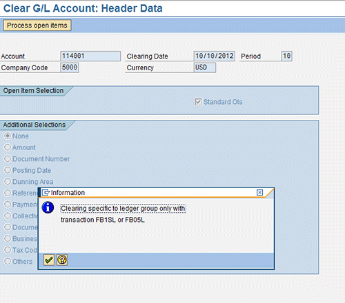 To clear these ledger-specific postings for GL account 114001, use transactions provided by SAP for Clearing Specific to Ledger Groups. I discuss these new transaction codes later in this article. If you try to use transaction F-03 instead (the transaction used for clearing of GL open items) for GL account 114001 and company code 5000, it does not work. The system sends an error message suggesting that you use separate transactions such as FB1SL or FB05L for clearing of open items for the GL accounts that are set for ledger-specific clearing (Figure 6).