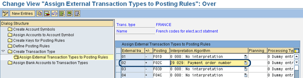 Handling of payment orders using electronic bank statements is a little bit different from other payment methods. First, within Customizing you must use interpretation algorithm 029 to clear invoices based on payment orders. You can find settings for electronic bank statements in IMG path Financial Accounting > Bank Accounting > Business transactions > Payment transactions > Electronic Bank Statement > Make Global Settings for Electronic Bank Statement.Within this customizing transaction you choose Assign External Transaction Types to Posting Rules and then assign the Interpretation Algorithm to External tra. . . – the external transaction type (Figure 10).