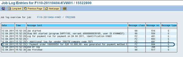 The maintenance of the number ranges completes the configuration for using payment orders in automatic payments. You now run the payment run — transaction F110 — for payment methods using payment orders. There is no difference between using F110 for payment methods with payment orders and using F110 for payment methods without payment orders, but the result will be different. When you use payment orders, no postings are generated, and the logging indicates that a payment order was created (Figure 3).