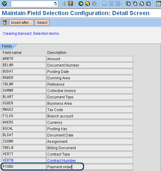 In the standard SAP system the option to use payment orders as a criterion for clearing has not been configured. The standard option to select payment orders is not available. Via Customizing you must add this option. You can do this via the transaction O7F1 or via the Customizing menu Financial Accounting > Accounts receivable and Accounts Payable > Vendor Accounts > Line Items > Open Items Processing > Choose Selection Fields. Press the Insert after. . . button to add the field PYORD, and save your entry by clicking the save icon