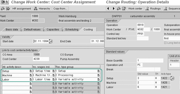 To view time events in the work center, use transaction CR02. The activities on the Costing tab determine what happens in the background during time events (Figure 1). In my example, I use the standard value key SAP1 with three standard time values: Setup, Machine, and Labor. Each of these production operations goes through three basic cycles: setup, processing, and teardown. Only one cycle is active at a time.