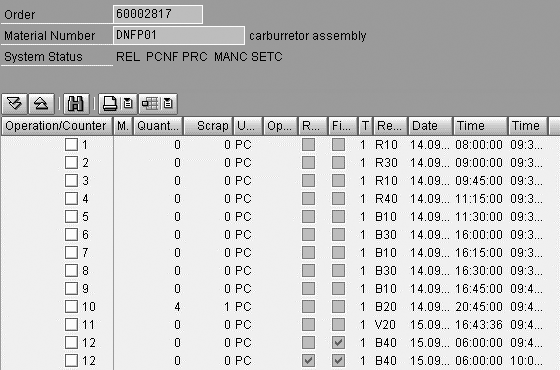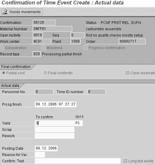 Follow menu path Logistics>Production>Shop Floor Control>Confirmation>Enter>For operation>Time event>Partial Processing to view the partial processing screen (Figure 3). Here you can view the operation’s status in more detail, such as setup finished, processing started, and teardown interrupted. You can confirm quantities during any of the record types, except the start record type. The start record types assume you have not yet produced anything, so you do not have any quantity fields. You can use the elapsed time between a start and a finish or between a start and an interruption to post an activity’s incremental value. This posting is not available to edit manually during the transaction because it is linked directly to the start and end times.