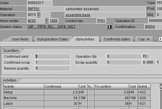 Follow menu path Logistics>Production>Shop Floor Control>Order>Display. Enter the order number and then click on Operations Overview. Select the operation, then click on Operation Details. Click on the Qty/activities tab (Figure 4). If you look at the operation’s confirmed activities in the production order, you can see the different values posted in the Confirmed column. The system calculated the Setup and Machine times from the elapsed times between the events. The system used one or several V20 partial variable activity transactions to post the Labor time.
