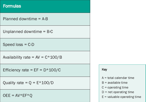 In these formulas, total calendar time includes non-working time and regular planned maintenance. You can plan this by creating production orders without materials to which you can book time events. Available time includes time lost on breakdowns and performing setups. Operating time includes slow running, excluding setups and interruptions. Net operating time stands for the theoretical time you should have taken to make the actual good and bad products if you had been running at full speed. Valuable operating time stands for time spent making good product at full speed.