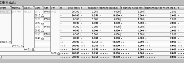 The AFKO, AUFK, and AFPO tables store the order header data and the AFVC table stores the operation data. You can construct a simple query to link these tables together and calculate an OEE at the operation level for each order using a small amount of ABAP code to calculate elapsed times and link them into the standard OEE calculations. I wrote a simple ABAP query that uses these tables to extract and calculate OEE. An example of the output is shown in Figures 8 and 9, with columns showing the intermediate figures before the system calculates OEE. I set up the report selections to select by order, plant, material, date, work center, or operation.
