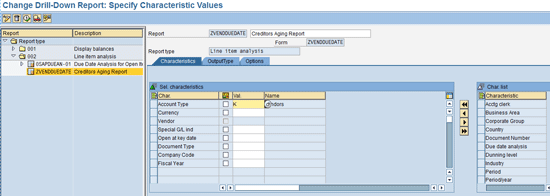 You can drag the available characteristics such as country or business area from the Characteristic list on the right context menu to the left side to make them available. If you add these characteristics, you can use them to analyze the data based on these characteristics in addition to the analysis done on the basis of the selected vendors. Enter K for the Account Type if you want to restrict the report only to the vendor. Only add the characteristic if it is really required for analysis purposes. Adding too many characteristics hampers the performance of the report. Click the OutputType tab.
