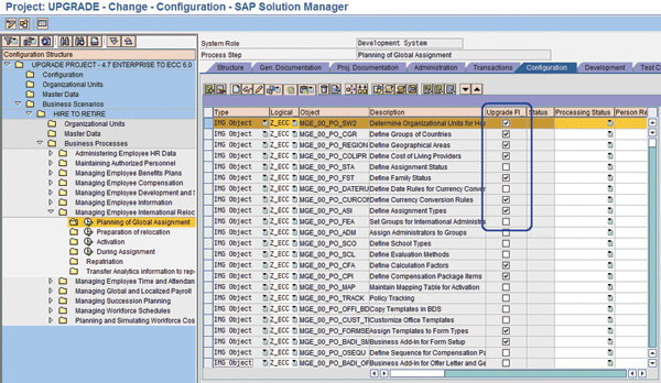 The Upgrade functionality, available through SAP Solution Manager, provides methodologies, accelerators (including release notes and guides), and tools that address each phase of a functional upgrade. The Upgrade Roadmap (version 3.2) provides SAP’s latest information and best practices for upgrading a system landscape. The Release Customizing View of a Project IMG allows you to compare two separate implementation guides (i.e., SAP 4.7 Enterprise and SAP ERP Central Component [SAP ECC] 6.0) and then flag certain IMG objects within the scope of your project as being “Upgrade Relevant.”