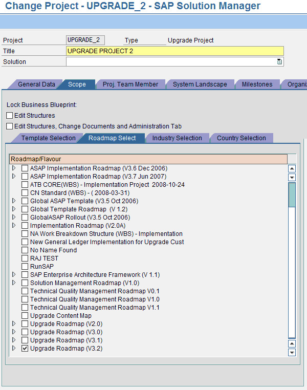 In transaction SOLAR_PROJECT_ADMIN, select your upgrade project and then click the Scope tab. Click the Roadmap Select tab, and then select the Upgrade Roadmap (V3.2) check box (Figure 2). Because the roadmaps are typically in alphabetical order, this roadmap is usually at the bottom of the list.