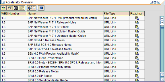Use the Accelerator tab of the detailed Roadmap view to access some of the most popular accelerators for an upgrade project, including a sample project plan, an SAP Solution Manager usage guide, descriptions of upgrade services, upgrade master guides, SAP release notes, and the product availability matrix. To get a list of all the accelerators from the Upgrade Roadmap, follow menu path Goto » Accelerators (Figure 5).