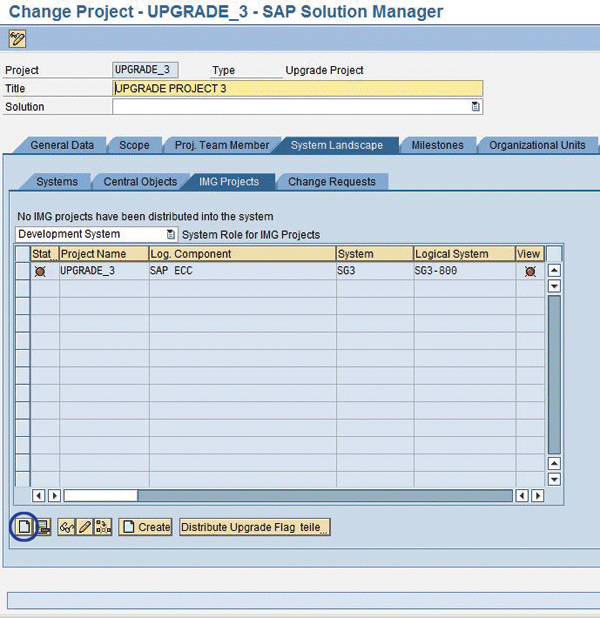 Once you have created the release customizing view of the project IMG, you need to distribute the upgrade relevant flag. The distribution goes through your existing list of IMG objects in your project and flags some of them as being upgrade relevant (essentially identifying which IMG objects have changed between IMG releases). To distribute the upgrade relevant flag, select your upgrade project in transaction SOLAR_PROJECT_ADMIN on the System Landscape tab. Switch to the IMG Projects tab. On the bottom of the tab, you will see the Distribute Upgrade Flag teile button (Figure 8).