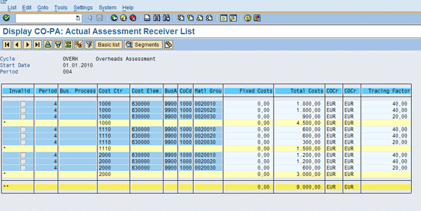 The cost posted to the COPAASSMNT group during the period 04, 2010 is EUR 9000. Figure 7 shows the cost center report (transaction KSB1) for period 04, 2010 (period from 01.04.2010 to 30.04.2010). Once the CO-PA assessment is executed through transaction KEU5, you can get the sender values by clicking the Sender button in the Display CO-PA: Actual Assessment Basic List screen (Figure 8). Figure 9 shows the sender values. Click the Receiver button to see the receiver values (Figure 10). EUR 9000 has been assessed to three material groups — 0020010, 0020020, and 0020030 — in the proportions 40%, 40%, and 20%, respectively.