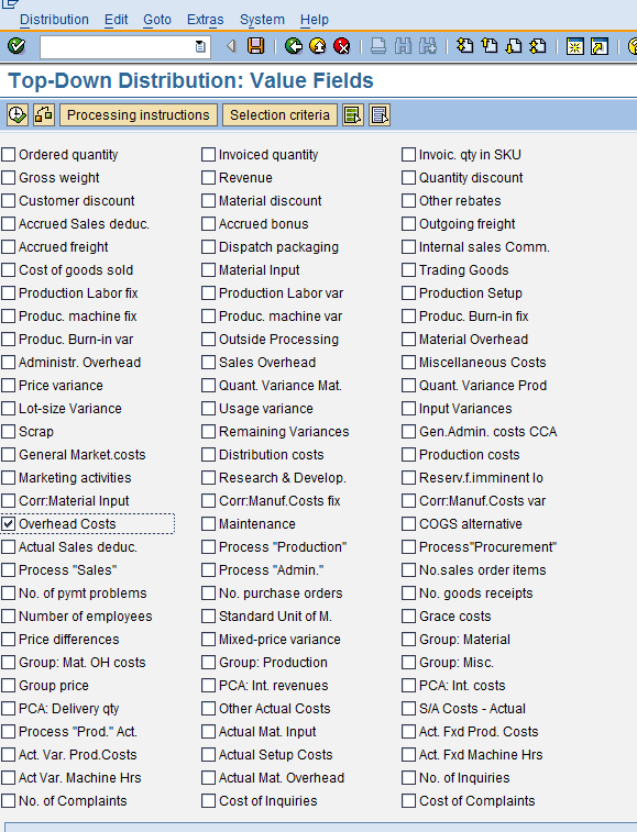 Top-down distribution is still useful for improving your managerial reporting despite these limitations. The expenses that cannot be posted at lower-level characteristics can be distributed later through top-down distribution. A few noteworthy examples are: