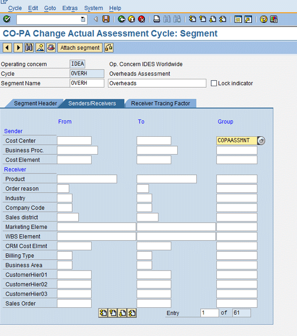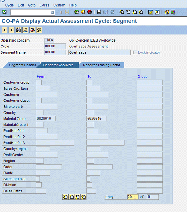 In the screen shown in Figure 3, enter the appropriate values for Assessment CElem (assessment cost elements), Fixed value field, Sender values, and Receiver tracing factor. Click the Senders/Receivers tab (Figure 4). Enter the cost center group COPAASSMNT as the sender. Click the page down icon if the required receiver is not in the screen (Figure 5). If you have a number of characteristics activated in CO-PA, then all the characteristics might not fit in one page of the screen and will be spread over a number of pages so you have to scroll down to see them all. Enter the material groups as receivers. Then click the Receiver Tracing Factor tab and input the proportion of assessment values to material groups. Figure 6 shows the receiver tracing factors for material groups with their respective proportions.