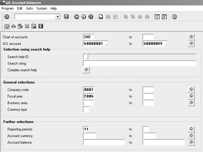 Consider this straightforward example. Say you want to execute the report G/L Account Balances RFSSDL00, as shown in Figure 1, for specific selection criteria. In this example, you are running the G/L balances report for period 11/2004, Company code 0001, account numbers 40000001 to 40000099, and Chart of accounts INT.