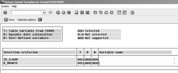 You can achieve this by using selection variables within variants. As the name suggests, variables are used to vary the values of the selection fields. You can set the variables settings for the fields by checking the Selection variable check box for the selection option fields and the clicking on the Selection variables button, as shown in Figure 3.