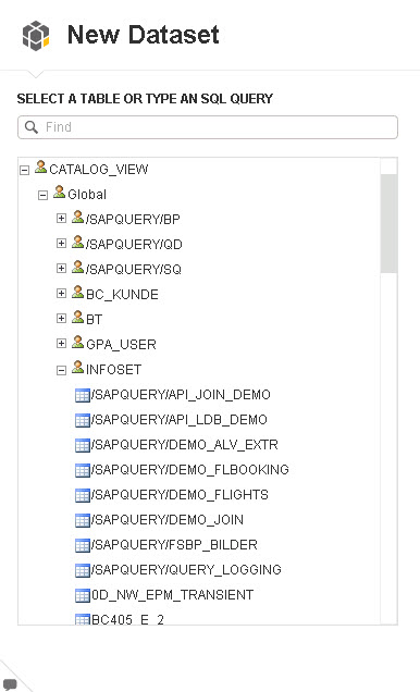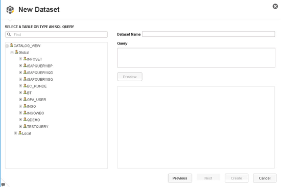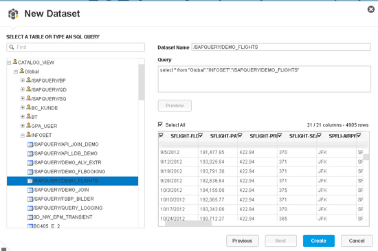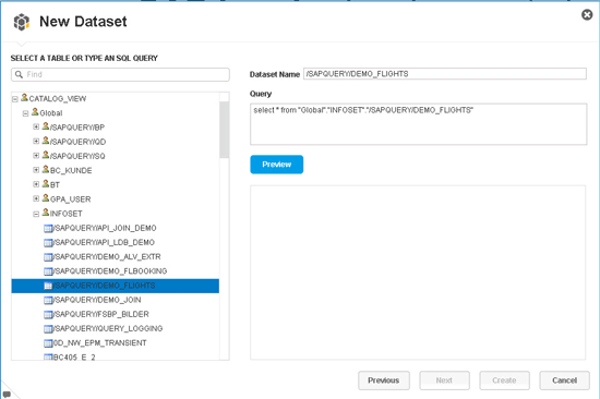 12. On the right side, you see the technical name of the InfoSet in the Dataset Name field. You should also see a SQL statement in the Query box asking for all the fields from the InfoSet. Notice that at this point in the data acquisition process, SAP Lumira does not provide a list of fields from the underlying InfoSet. In addition, note that SAP Lumira is not able to provide a list of selections from the InfoSet for input.