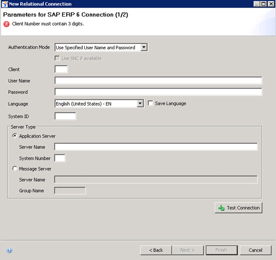 7. Enter the details of your SAP ERP system in Figure 4, as follows: In the Server Type field drop-down options you can select Application Server or Message Server. If you select the Application Server option, you have to provide the full qualified server name and the system number of your SAP ERP system. If you select the Message Server option, you need to provide the full qualified name of the Message Server and the corresponding Logon Group.