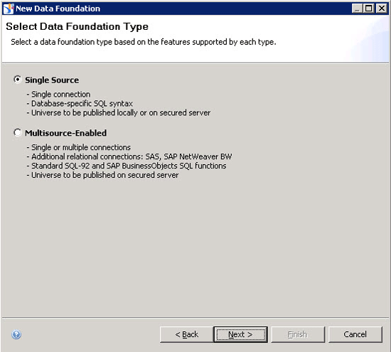 22. You are asked whether you would like to create a single-source or a multi-source foundation. For this example, select the Single-Source radio button and click the Next button.