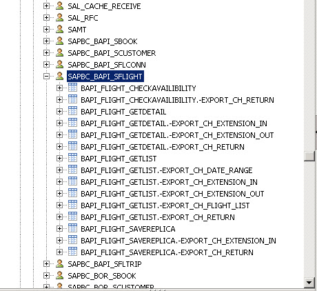 24. Open the list of sources as part of your newly established connection, and navigate to the list of ABAP functions and then to the SAPBC_BAPI_SFLIGHT function group (Figure 18).