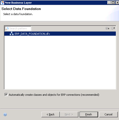 23. In the screen that appears (not shown), select the secured data connection shortcut that you created in the previous step, and click the Finish button. This opens the screen in Figure 17, where you can now open the connection as part of the data foundation and browse all the available sources.