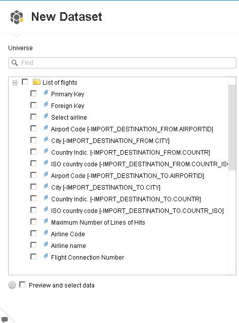 13. Click the Preview button, which opens the screen in Figure 8. SAP Lumira lists all the fields with their technical names. Now you can determine which of these fields should become part of your analytical content.