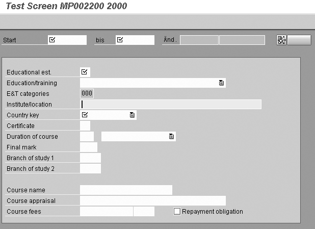 Note that the Institute/location field in this test display of screen 2022 appears open for data entry even though the new lookup field exists with drop-down capabilities to its left. This is not the way that an infotype screen normally appears in this type of situation. Here’s where some very clever coding by SAP’s ABAP programmers comes into play.