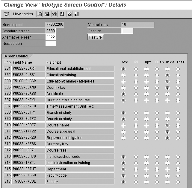 Screen 2022 for education infotype 0022 with additional Institute/location field SCHCD