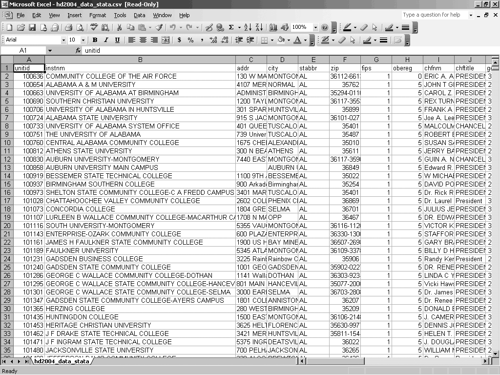 You can find this list at the NCES Web site: https://nces.ed.gov/ipedspas/index.asp. From there, click on the Guest level link, accept the terms, and click on Dataset Cutting Tool (DCT). From the Dataset Cutting Tool screen, pick Download data files and then select the latest year and Institutional Characteristics and Student Charges from the drop-down menus. Click on the Get button. HD2004_STATA (https://nces.ed.gov/ipedspas/dct/download/data/HD2004_Data_Stata.zip) is the basic IC data and the Dictionary link (https://nces.ed.gov/ipedspas/dct/download/data/HD2004_Dict.zip) provides the file layout.