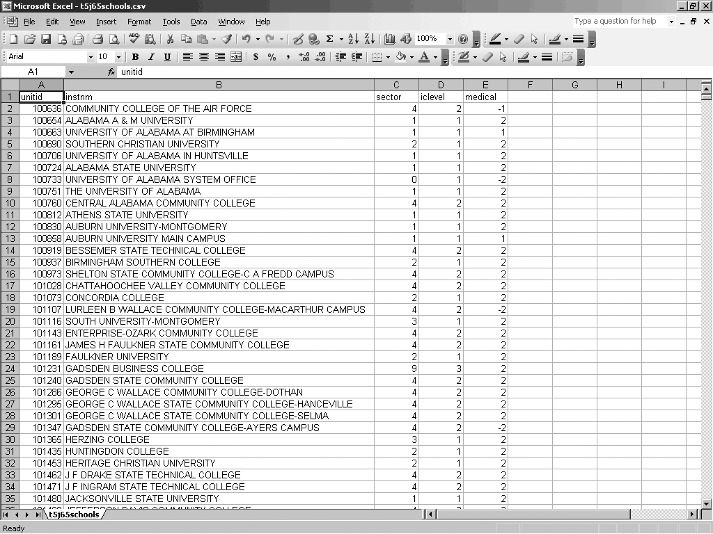When loading table T5J65, I suggest that you eliminate all fields from the downloaded CSV file (as I have done in example file which can be downloaded here: download) with the exception of UNITID, INSTNM, and any other fields that you may choose to implement for your custom categorization solution. The example load program uses fields UNITID, INSTNM, SECTOR, ICLEVEL, and MEDICAL (Figure 6).