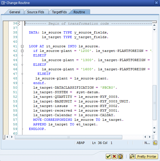 In my example below, I want to change the content of the field Plant. If the data coming from the source system is 1200 and if I want it to be A2001018, and if the content of the field plant coming from the source system is 1300 or 1600 and I want it to be different, I would use the ABAP codes shown in Figure 28.