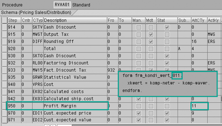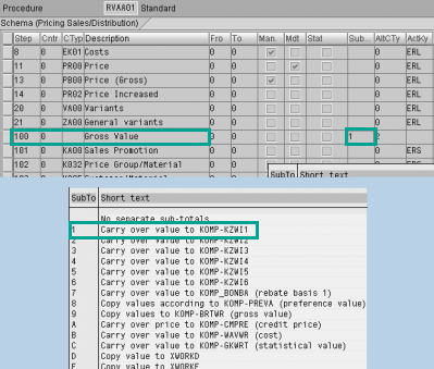 If you use SubTo variable code 1, 2, 3, 4, 5, or 6, these values are also permanently stored in table VBAP (sales document: item data) and are available for custom reports or for export to SAP Business Information Warehouse (BW). Note that standard SAP pricing procedure RVAA01 stores the gross value to VBAP- KZWI1.