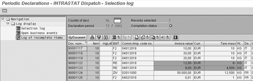 On the navigation side of the screen (left side), you can also select the log display called Log of incomplete items. Via this log, you can correct the incomplete documents. The documents that are highlighted in Figure 6 are returns; these documents are reported via the receipt report. Manually created Intrastat items, using transaction VEFU or directly via the cockpit, are not shown in the first step. They are included in the second step.