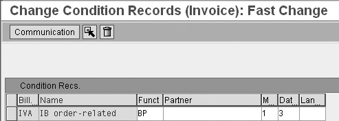 The default condition table configures the condition type by customer billing type. You do not need to have sophisticated output condition table logic to identify order-related inter-company billing transactions because the code you added to USEREXIT_KOMKBV3_FILL is sufficient. Also, you don’t need to differentiate between order-related inter-company billing and order-related inter-company credit memos because the code in the standard report RVIVAUFT performs this task for you.
