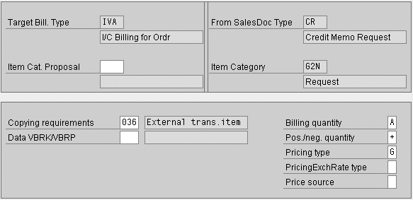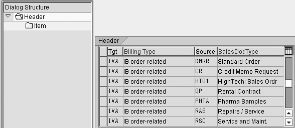 Step 1. Define billing types IVA and IGA. You can use standard creation billing types IVA and IGA, but your system might not have IVA or IGA defined. Go to transaction VOFA to create IVA and IGA as a copy of billing types IV and IG. If you make any configuration changes to the standard settings (e.g., a document pricing procedure, output determination procedure, or text determination procedure), I advise copying IVA to ZIVA and IGA to ZIGA via transaction code VOFA.