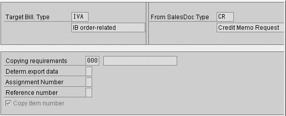 Step 2. Configure billing copy control for billing types IVA and IGA. For Sales and Distribution (SD) invoicing, you must configure the relationship between the reference documents (e.g., orders or deliveries) and the billing document. Billing copy control manages the flow of data from one SD document to another. In my example, the flow of data is from the sales order to the billing document.