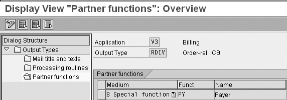 Then click on Partner functions in the Dialog Structure. In the screen that appears, set the partner function (Funct) to PY and the Name to Payer for the transmission medium 8 Special function, as shown in Figure 8. This configuration process determines which partner number the system assigns to the output type RDIV in the customer invoice.