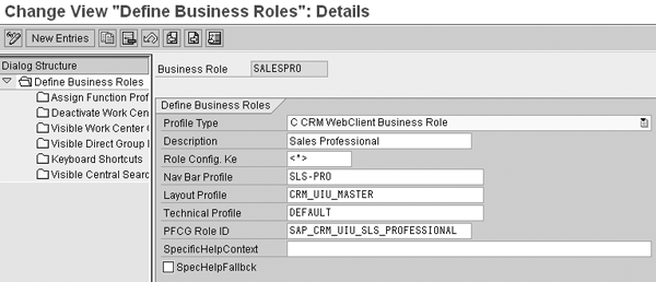 The release of SAP CRM 2006s/2007 introduces the Business Role, a new core object in the determination of the user navigation through the SAP CRM system. Each user is assigned to a Business Role that defines the available functionality in the L-shaped view, which contains the work centers and logical links.