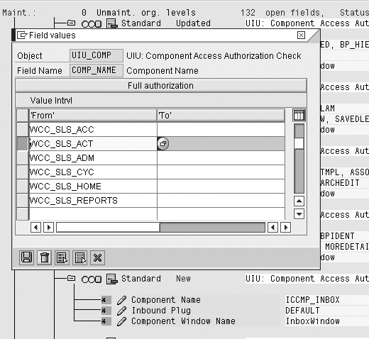 Unfortunately, you cannot search for individual field values in authorization objects. You need to look through each of the UIU_COMP entries to find the work center. For example, work center SLS- ACT is listed as WCC_SLS_ACT. Most work centers have component name WCC_* where the asterisk is the work center name as specified in the Navigation Bar Profile. To restrict access to this work center, you need to click on the delete icon to delete this entry. Then regenerate your profile.