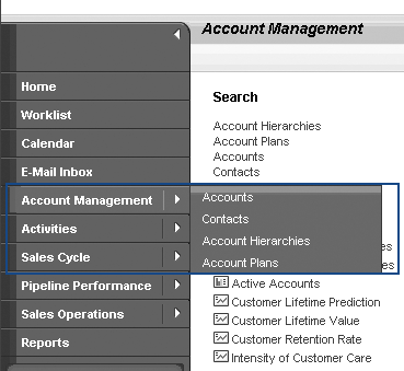 Figure 2 shows the Navigation Bar Profile SLS-PRO and the work centers assigned, such as work center SLS-ACC for Account Management. The position specifies the order they appear on the left side of your work center L-shaped area. As specified in the configuration, the Account Management work center appears in the fifth position in the work center listed on the left side of the UI home page (Figure 3).