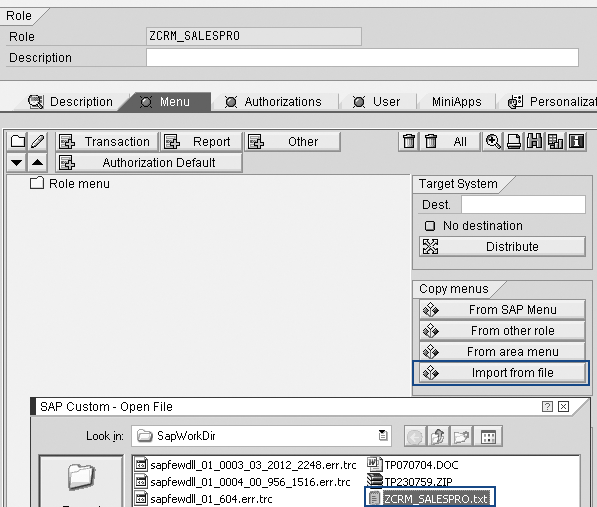 The program also generates a file that contains all the components and authorization objects. The file is automatically saved to your local SAPWorkDir directory. Your Business Role name is the file name — in my example, the file name placed in the SAPWorkDir is ZSALESPRO.txt.