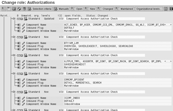 To do this, go to transaction PFCG, navigate to the Authorizations tab and click on the Change Authorizations button. Now you need to locate where the SLS- ACT work center has been added to your profile. Perform a search for component UIU_COMP by clicking on the Search button, entering the authorization object UIU_COMP, and clicking on the Find Object button. This takes you to a list of all the included UI components.