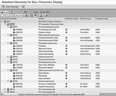 Step 1: Define the activity dictionary. The activity dictionary in R/3 is the business process hierarchy. This is similar to a cost center hierarchy. It is simply a grouping of all the “activities” you intend to use for ABC. You can access this using Accounting>Controlling>Activity-Based Costing>Master Data>Standard Hierarchy>Change. In this hierarchy, you can see who is responsible for each business process, and you can access the master data for each of the business processes. Figure 2 shows a sample business process hierarchy from an IDES system.
